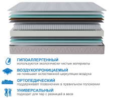 В основе данной модели лежит блок независимых пружин, данный тип пружин гарантирует правильную поддержку позвоночнику спящего, т.к. пружины работают независимо друг от друга, то обратное давление будет оказываться только там где это действительно нужно. Для защиты комфортных слоев матраса используется специальное термоволокно, которе предотвращает истирание слоев во время эксплуатации. Латексированный кокос, используемый в этой модели, в качестве основного комфортного слоя, делает одну из сторон более жесткой по отношению к другой, что дает вариативность и страхует от ошибки при выборе жесткости. Вторая сторона матраса усилена особо прочной и упругой пеной, которая позволит хорошо высыпаться.. Обращаем ваше внимание, что матрас отвечает за правильность положения нижнего и среднего отделов позвоночника, а за шейный- отвечает правильно подобранная ортопедическая подушка. Для увеличения срока эксплуатации матраса рекомендуем приобрести защитный чехол AquaStop.